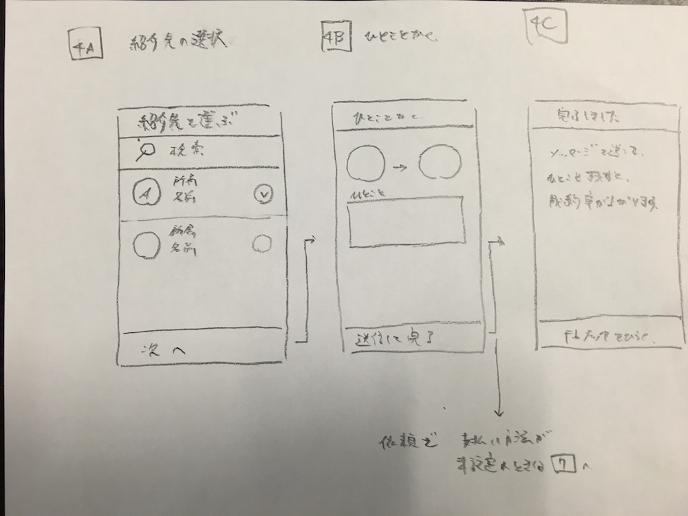 | 1 | 依頼者 | A.依頼内容の記述、B.報酬を設定し、C.友人から一名名指しして、依頼を登録し、Facebookメッセージで相手に送信 |