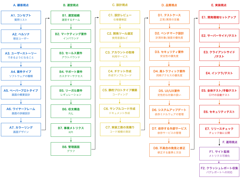 そんな経験を何回かやるなかで、できるだけ開発プロセスが抜け落ちないように工夫してできたのが、以下の内容です。実際は、もっと詳細にそれぞれの項目について記述しているのですが、ここでは概要という感じで簡単に紹介したいと思います。